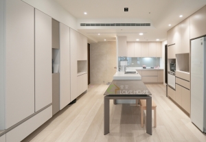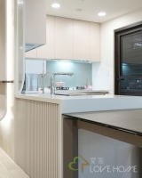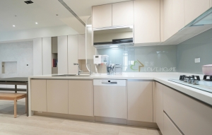 整體空間以柔和奶茶色系為主軸,搭配淺木地坪與俐落線條,呈現乾淨純粹的設計語彙。 廚房規劃以中島結合餐桌,提升場域機能的靈活性,同時串聯料理與用餐動線。 櫃體以隱藏式收納手法消弭凌亂感,讓視覺保持純淨一致。 在光影的映照下,展現溫潤卻不失質感的現代居家氛圍。