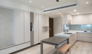 以奶茶色營造溫雅氛圍,並透過中島設計提升場域機能