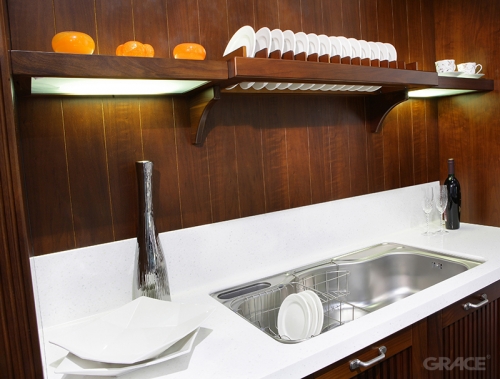 實木層板燈插盤架 選配實木層板燈插盤架,可將經常使用的餐盤清洗完後放置於此,需要時隨手可得。而層板燈的間接光與實木搭配,可營造出柔和的鄉村氛圍。