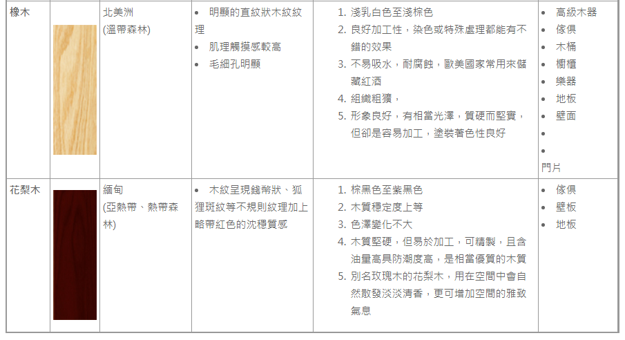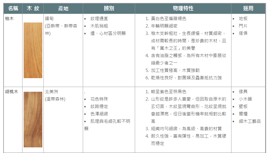 GRACE 擁有六大類不同樹種的質材,可滿足不同的規劃及設計需求,我們簡易整理如下表所示,如有興趣也可至門市諮詢。