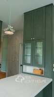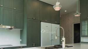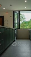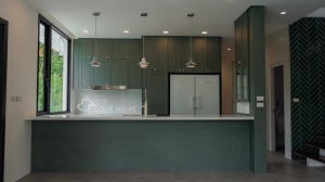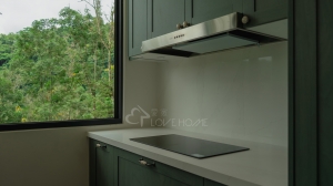 大面積窗景引光納景,將山林綠意化為日常背景。 霧面綠色櫥櫃沉穩優雅,搭配俐落中島動線, 以簡約設計展現細膩質感, 勾勒出專屬於生活的高雅廚房美學。