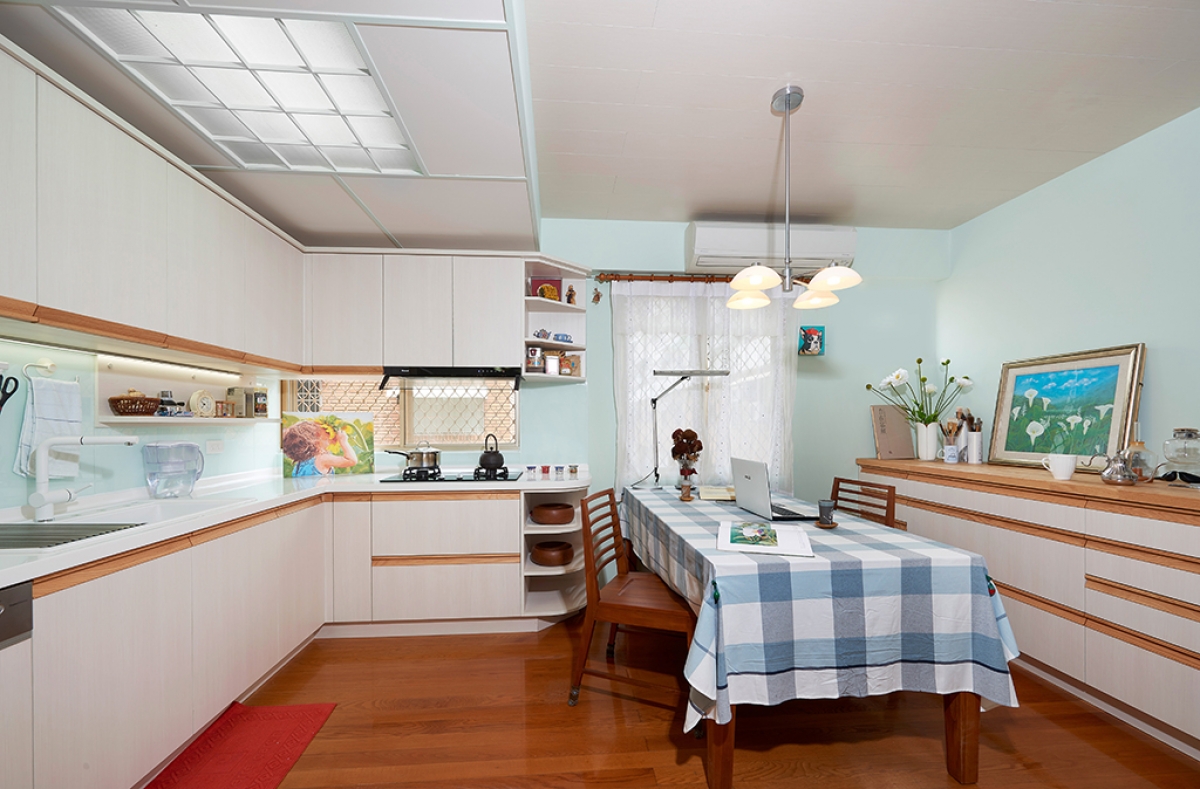 簡約混搭的配色,運用實木把手線條勾勒出空間美學的韻味
